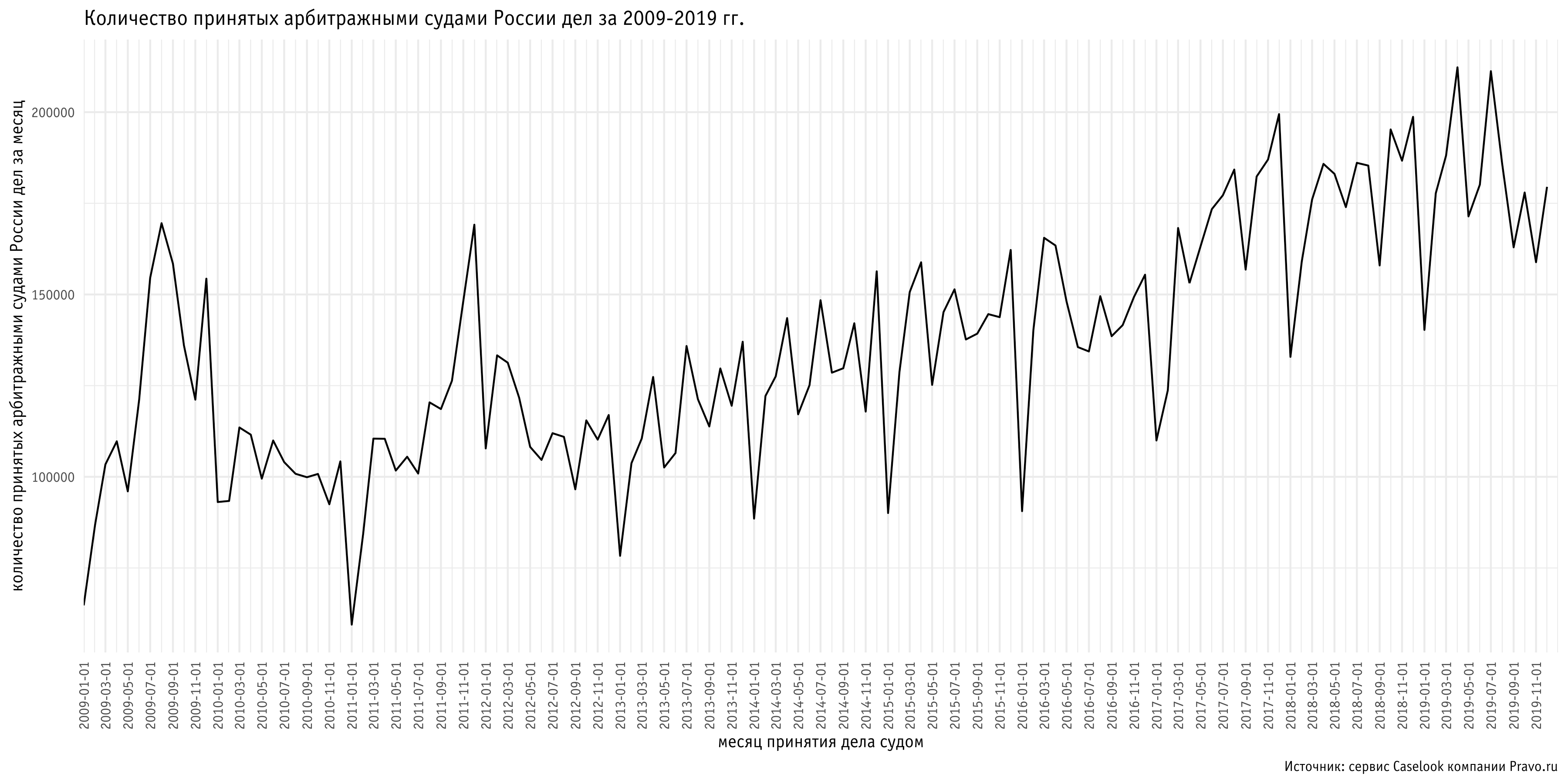 Задача 1. На рисунке ниже представлено помесячное количество дел, которое принимали к рассмотрению российские арбитражные суды в 2009-2019 гг., согласно данным Картотеки арбитражных дел. На этом графике можно увидеть одно качественное изменение. Опишите, когда, на ваш взгляд, это изменение произошло, подробно обосновав вашу точку зрения. (При нажатии на рисунок он откроется в крупном виде.)