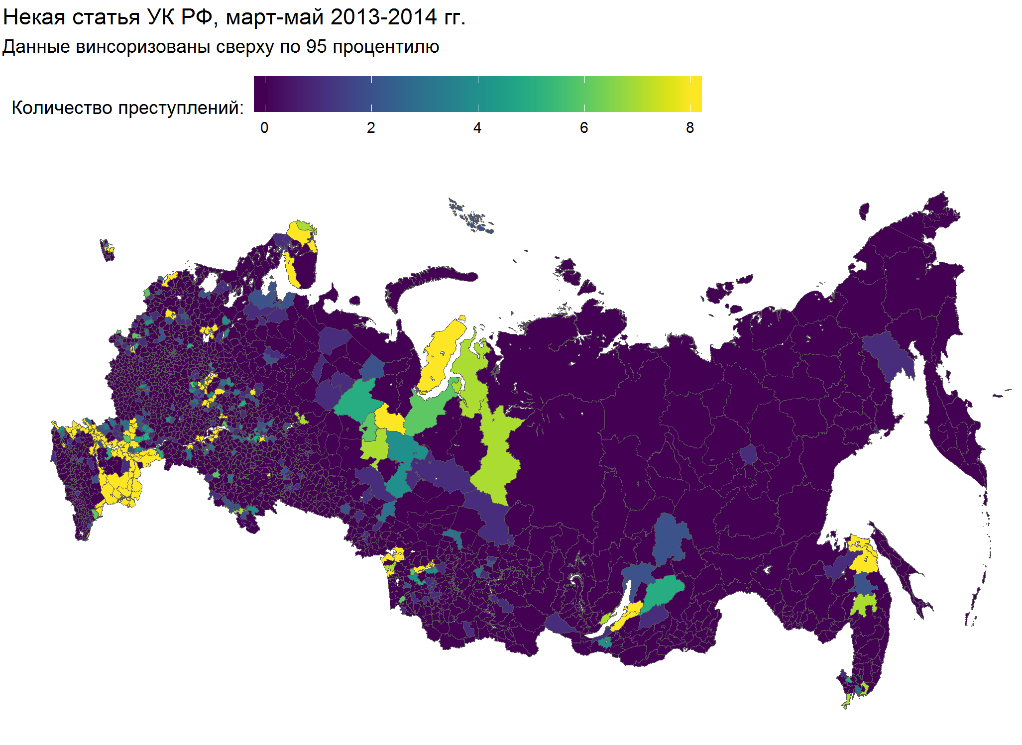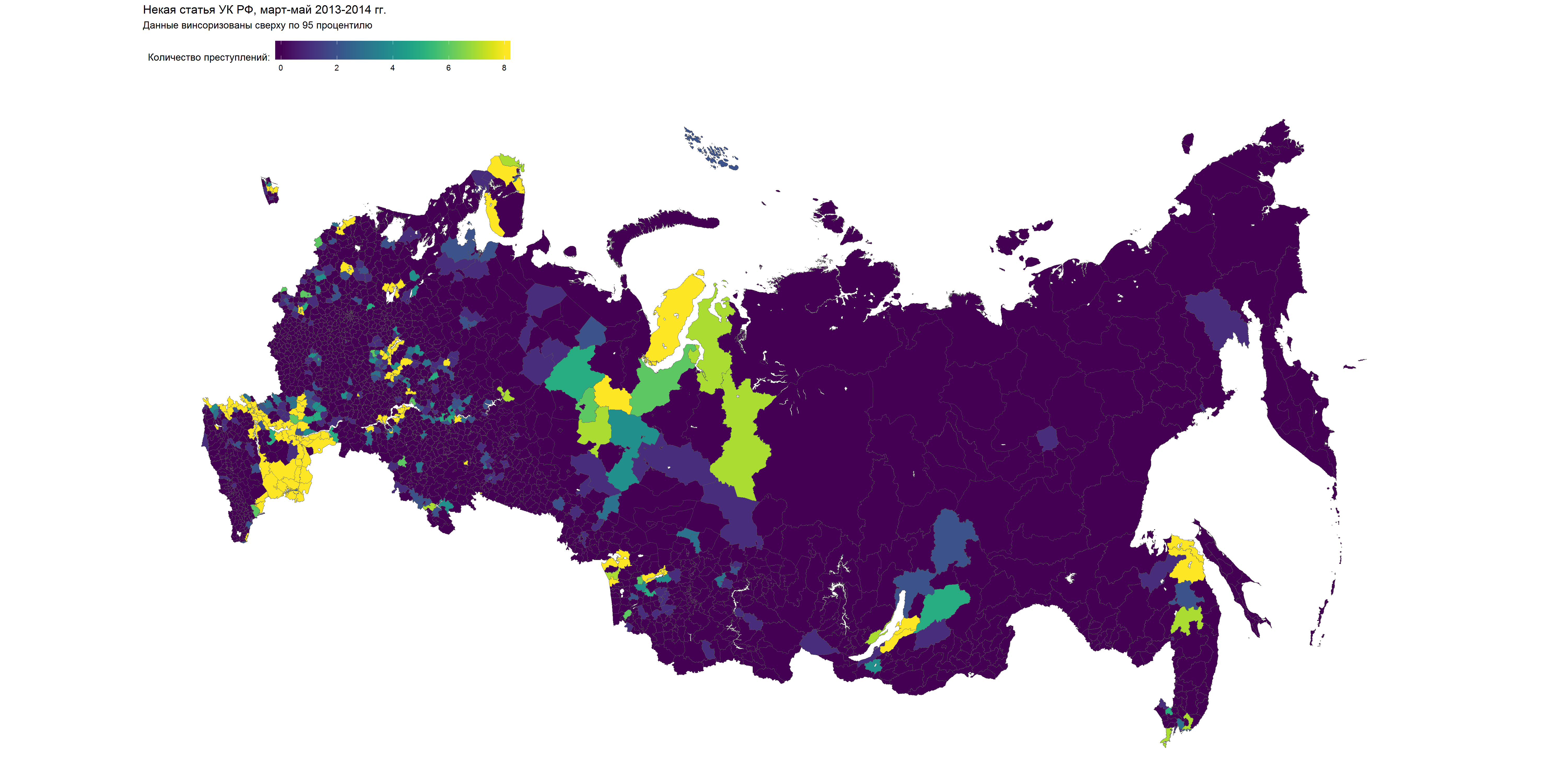 Задача 2. На рисунке ниже вы можете наблюдать частотное географическое распределение зарегистрированных преступлений, предусмотренных определённой статьёй Уголовного Кодекса РФ. Обоснованно предположите, о каких преступлениях идет речь. (При нажатии на рисунок он откроется в крупном виде. Можно также посмотреть на более детализированную версию рисунка)