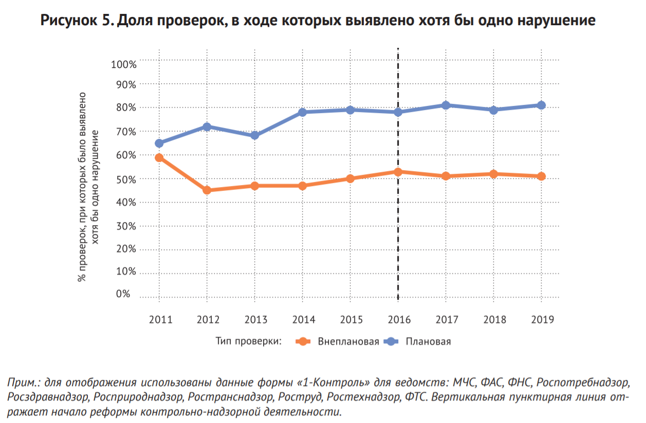 Задача 3. Считается, что в ходе внеплановой проверки проще обнаружить нарушения, потому что проверяемые не успевают подготовиться и «спрятать» нарушения. Однако в России контрольно-надзорные органы фиксируют хотя бы одно нарушение в 80% плановых проверок и только в 50% внеплановых (см. рисунок ниже, источник). Попытайтесь объяснить этот видимый парадокс работы российских контрольных ведомств.